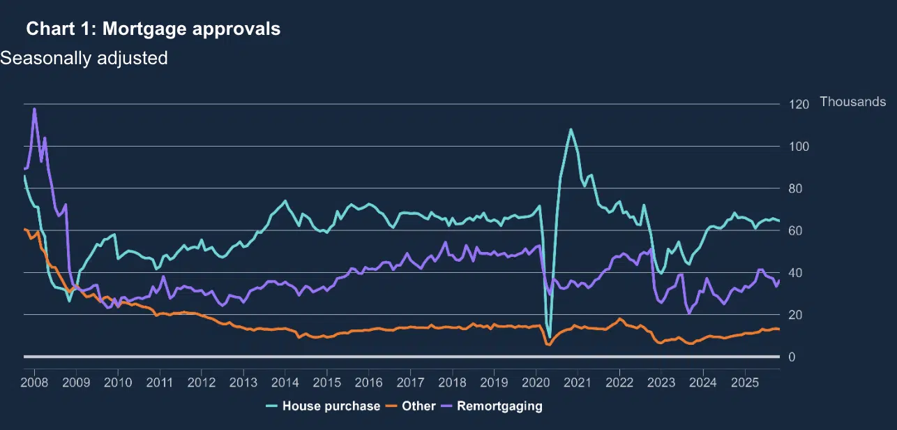 The ‘effective’ interest rate on newly drawn mortgages increased for the first time since February 2025 to 4.20% in November 2025, up from 4.17% in October. As a result of this and budget caution, net mortgage approvals for house purchases fell by 500 to 64,500 in November. By contrast, approvals for remortgaging with a different lender rose by 3,200 to 36,600 in November when seasonally adjusted. However when not adjusted both mortgage approvals  and remortgaging figures fell by 10,299 and 1,700 respectively.
